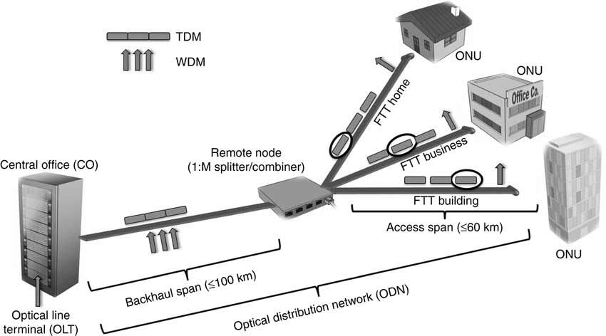 • It transmits data from the central site to the optical network terminal (ONT) or optical network unit (ONU) at the user end, and vice versa.